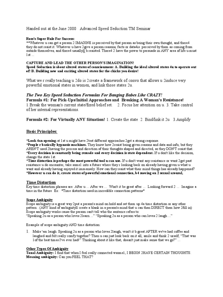 Here you can find ross jeffries speed seduction pdf shared files. KB free from TraDownload. Coinvolge l´uso del linguaggio in modo da generare attrazione, creare una connessione e suscitare dei sentimenti nella ragazza per ancorarla a te. There are both audio and PDF document files here (besides this.nfo and screen shots).